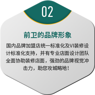 国内品牌加盟店统一标准化及VI装修设计标准化支持,并有专业店面设计团队全面协助装修店面,强劲的品牌视觉冲击力,助您攻城略地!