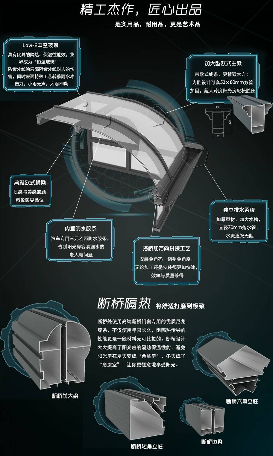 7. 铝型材断桥隔热技术:大大提高了阳光房的隔热保温性能,避免阳光房在夏天变成"桑拿房",冬天成了"急冻室"。