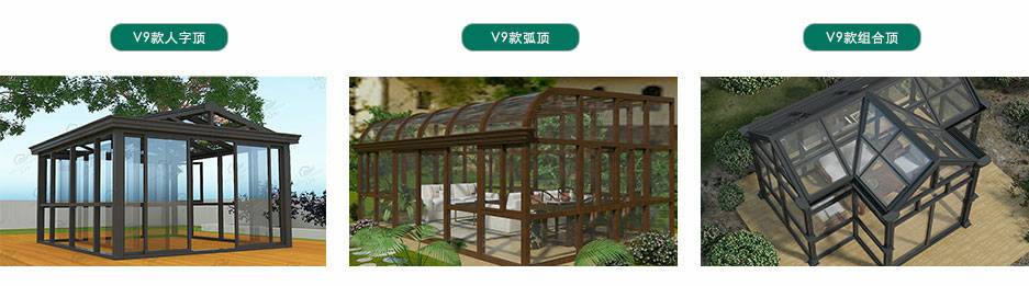 款式:V9款人字顶阳光房、V9款弧顶阳光房、V9款组合顶阳光房(可定制其他造型)